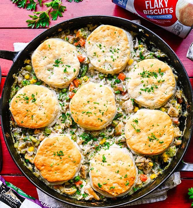 - Bake for 25-30 minutes, until the biscuits are golden brown and the pot pie is bubbly.