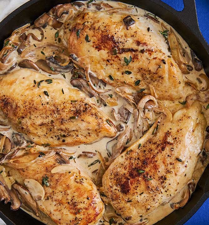 - Add chicken back to pan, nestling the breasts into the bed of mushrooms. Pour cream over chicken, cover pan, and reduce heat to medium-low. Simmer until internal temperature of chicken reaches 160℉, about 20 minutes.